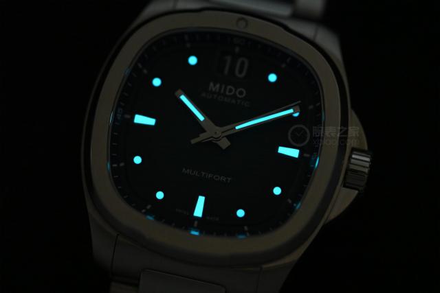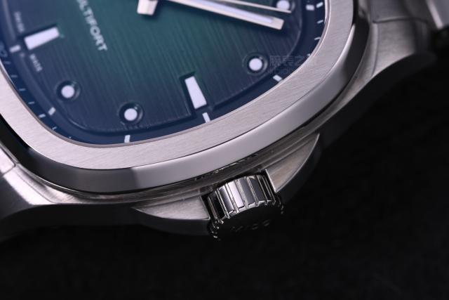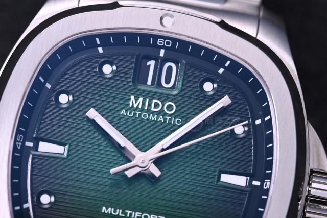 表盤顏色從綠色漸變至黑色,采用水平拉絲處理,細(xì)膩的紋理增添了表盤的質(zhì)感。12時(shí)位置沿用美度標(biāo)志性的大日歷,既增強(qiáng)了讀取效率,在盤面上也不顯得突兀。時(shí)標(biāo)采用凹陷設(shè)計(jì),3、6、9時(shí)用棒狀時(shí)標(biāo),其余為點(diǎn)狀時(shí)標(biāo),增加了盤面的層次感。