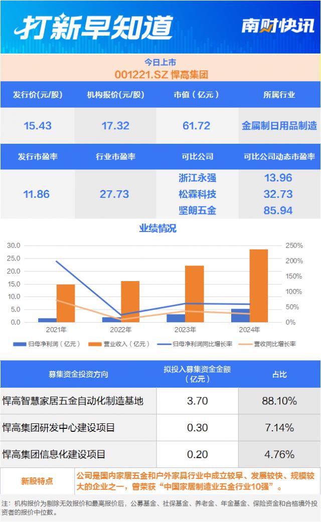 7月30日,悍高集團(tuán)(001221.SZ)在深主板上市。該公司位于佛山,主要從事家居五金及戶外家具等產(chǎn)品的研發(fā)、設(shè)計(jì)、生產(chǎn)和銷售。