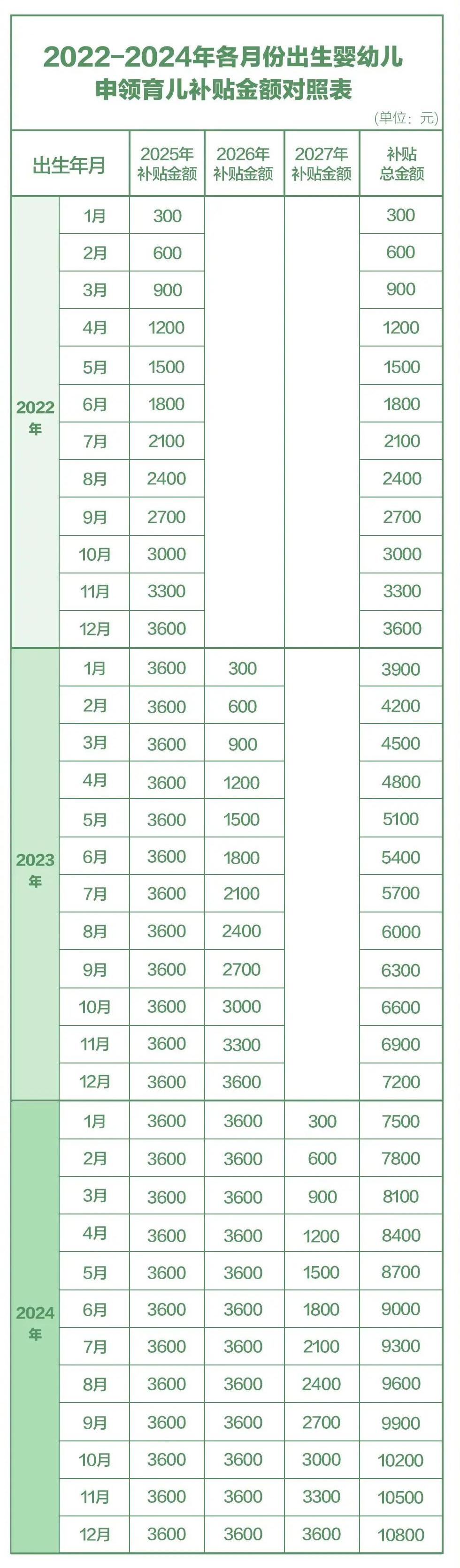 2022 - 2024年出生的孩子也有補(bǔ)貼,只是金額會少一些,按月份折算。具體能領(lǐng)多少,官方已提供表格,一目了然。