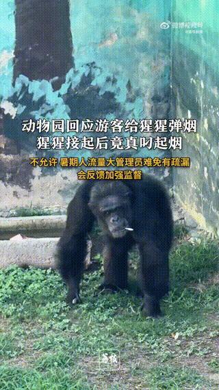 近日,山東威海西霞口神雕山野生動(dòng)物園,有游客給猩猩拋送點(diǎn)燃的香煙,猩猩叼起煙吸煙。動(dòng)物園工作人員回應(yīng)稱不認(rèn)同此行為,暑期人流量大,管理員可能有疏漏,會(huì)加強(qiáng)管理。