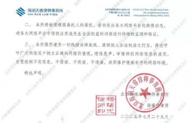 正告各侵權主體立即停止并不得再實施相關侵權行為,包括但不限于立即刪除全部已發(fā)布或轉(zhuǎn)載的含有歪曲事實、污蔑詆毀、造謠誹謗等內(nèi)容的圖片、文章、評論等侵權內(nèi)容并消除不良影響。本所律師已就相關侵權主體的行為進行了取證,并正在按照委托人的委托對持續(xù)實施侵權行為的主體采取包括但不限于民事訴訟等法律措施,維護委托人及其旗下藝人汪蘇瀧先生的合法權益?!?/p>