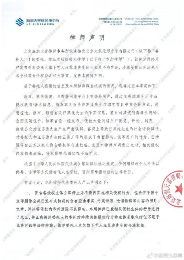 聲明指出:“近日,新浪微博、豆瓣等網(wǎng)絡平臺上有部分用戶,通過主觀臆測音樂作品授權狀態(tài)/署名信息、斷章取義歪曲汪蘇瀧先生在綜藝節(jié)目中言論等方式,惡意捏造、散布、影射有關汪蘇瀧先生的不實信息,甚至對其使用侮辱性隱喻,企圖混淆視聽。這對委托人和汪蘇瀧先生的正常工作均造成了負面影響,已涉嫌侵犯汪蘇瀧先生的名譽權等合法權益。