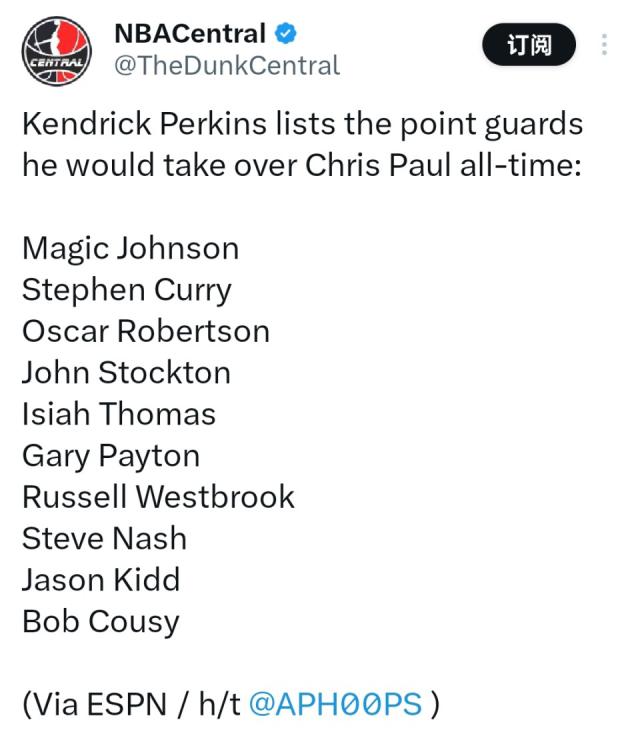 帕金斯隨后列出了他心中的前十控衛(wèi)名單:魔術(shù)師、庫里、大O、斯托克頓、伊塞亞 - 托馬斯、佩頓、威少、納什、基德、庫西。
