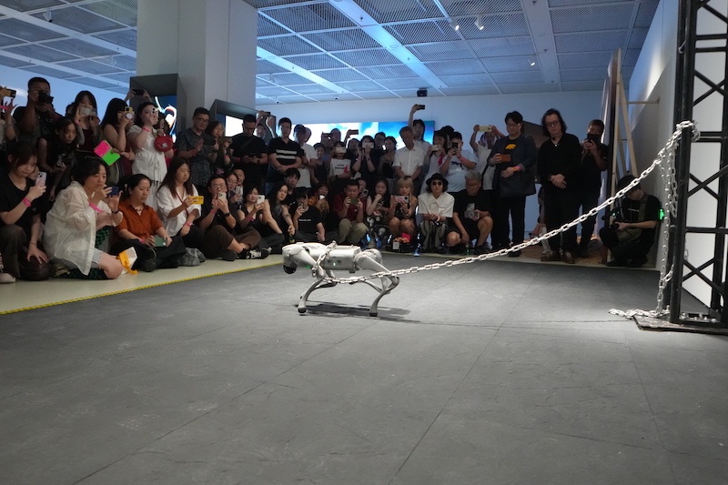 藤堂高行在上海民生現(xiàn)代美術(shù)館“提視造境”中呈現(xiàn)的作品《拴狗的動能》展示了想從束縛中解脫的機(jī)器人。他表示,盡管創(chuàng)作過程中有不同類型作品,但核心關(guān)切相同:如何在與機(jī)器交互中認(rèn)識自己。機(jī)器人融入人類社會,它們對人類心理與認(rèn)知的影響是需要提前思考的問題。