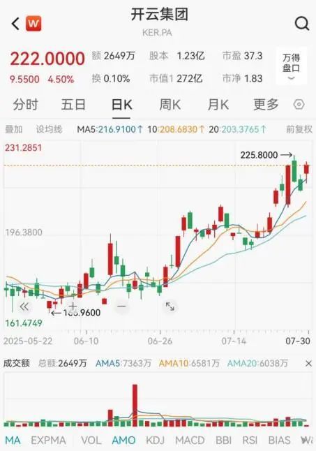 截至記者發(fā)稿,開(kāi)云集團(tuán)股票報(bào)222歐元/股,單日漲幅為4.5%。