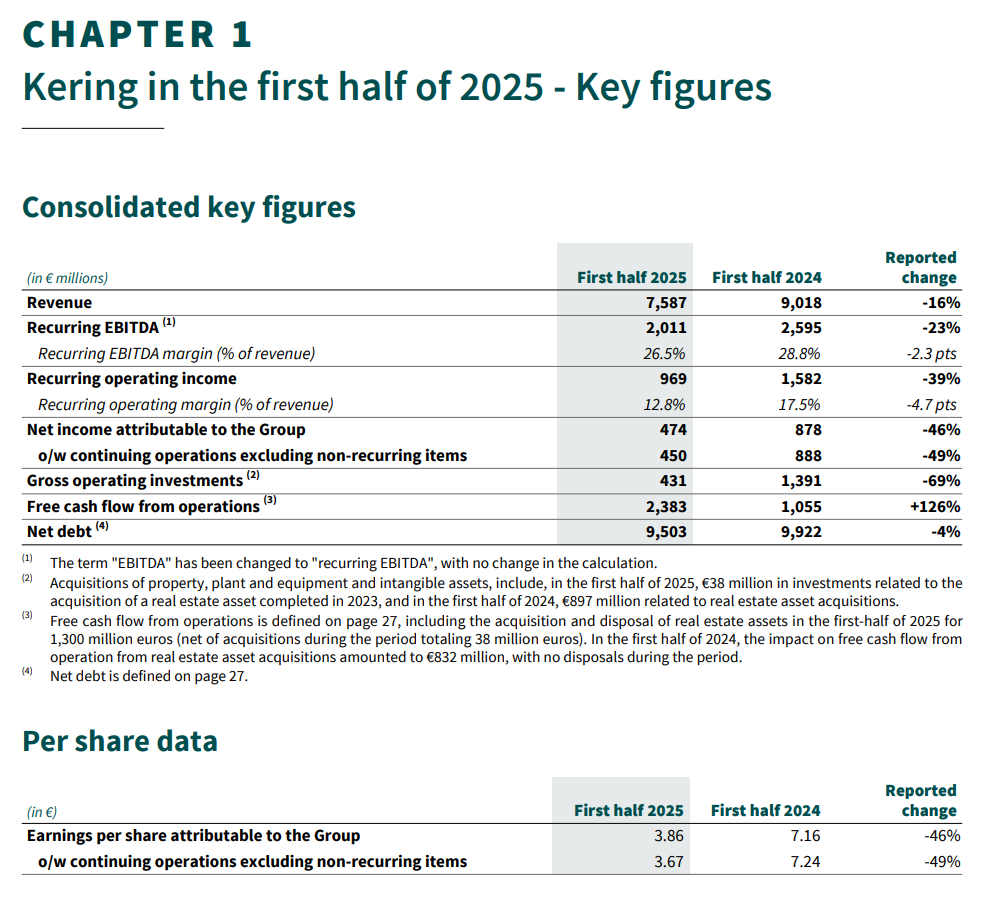 財(cái)報(bào)數(shù)據(jù)顯示,開(kāi)云集團(tuán)2025年上半年?duì)I業(yè)收入約為76億歐元,同比下降16%;經(jīng)常性營(yíng)業(yè)利潤(rùn)約為9.69億歐元,同比下降39%;凈利潤(rùn)為4.74億歐元,同比下降46%。