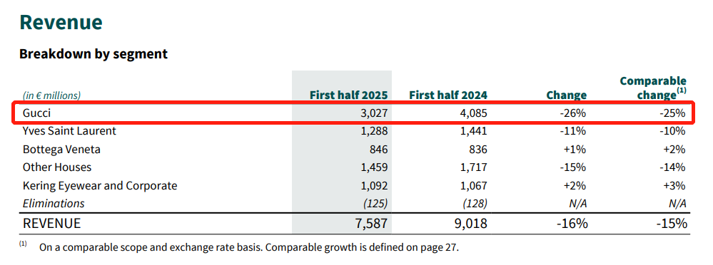 集團(tuán)核心品牌古馳(Gucci)表現(xiàn)持續(xù)不佳,上半年?duì)I收約為30.27億歐元,同比下降超25%;第二季度營(yíng)收約為14.56億歐元,同比降幅超25%。