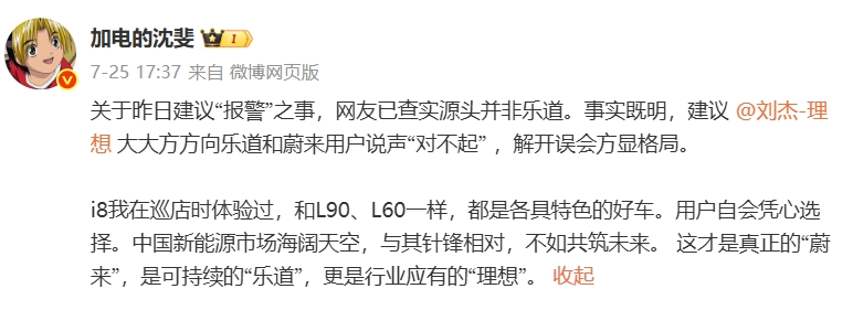 7月25日,蔚來高級副總裁、樂道總裁沈斐喊話劉杰道歉,稱源頭非樂道。