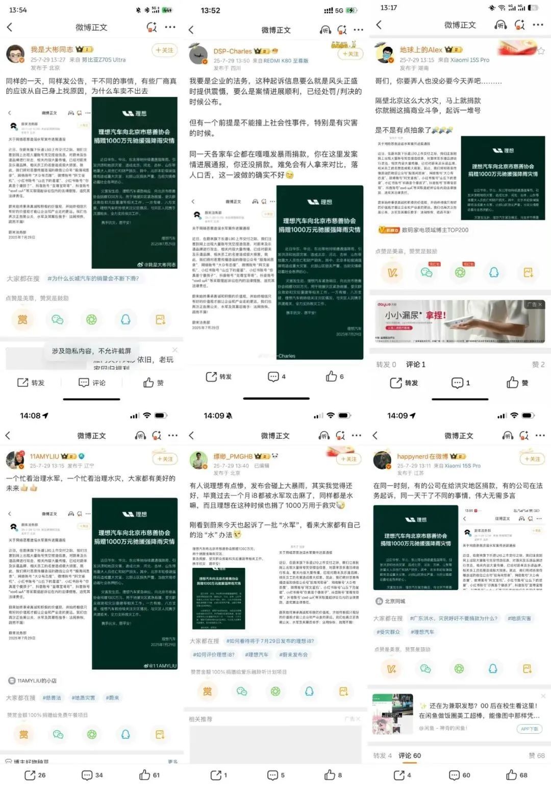 理想i8發(fā)布會當(dāng)天,蔚來法務(wù)部發(fā)通報,理想汽車捐款1000萬元馳援災(zāi)情,多個微博賬號對比兩者,引發(fā)品牌“公關(guān)戰(zhàn)”。
