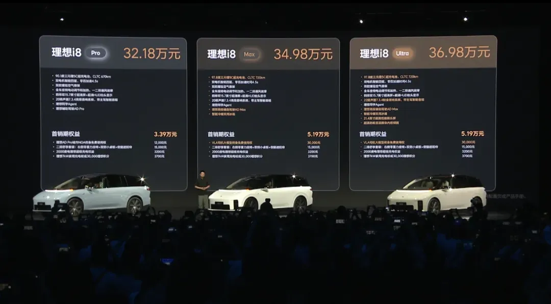 理想i8推出Pro、Max、Ultra三個配置版本,全國統(tǒng)一零售價分別為32.18萬元、34.98萬元和36.98萬元,新車將于2025年8月20日開啟全國交付。