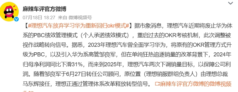 媒體報道,理想將廢棄PBC績效管理模式,回歸OKR模式。PBC模式學(xué)自華為,鄒良軍出身華為銷售系統(tǒng)管理崗位。