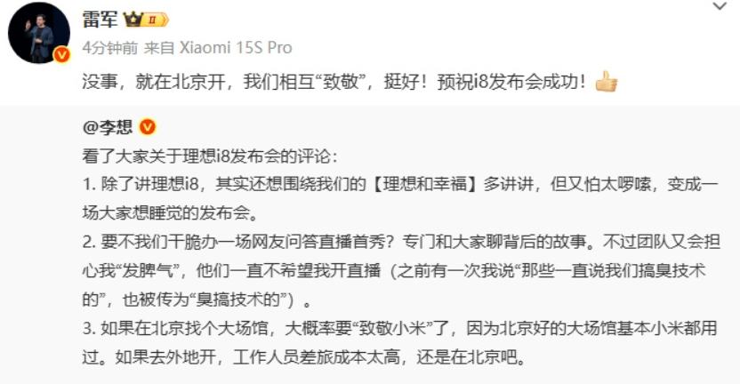 李想發(fā)微博“致敬小米”,雷軍回復(fù)互相致敬。網(wǎng)友調(diào)侃理想格局大,也可見其壓力。
