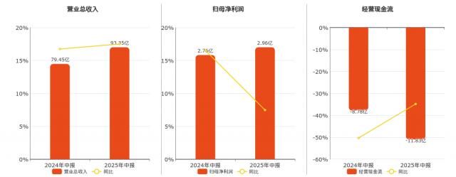 公司營(yíng)業(yè)總收入達(dá)到93.35億元,歸母凈利潤(rùn)為2.96億元。不過(guò),經(jīng)營(yíng)活動(dòng)現(xiàn)金凈流入為 -11.83億元,和去年同報(bào)告期相比,經(jīng)營(yíng)活動(dòng)現(xiàn)金凈流入減少了3.06億元。