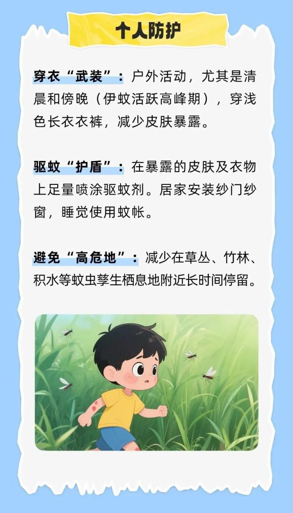 ②穿淺色長袖衣褲(蚊子對(duì)深色衣物的趨性是淺色的3倍);③避開清晨和傍晚(花斑蚊活躍時(shí)段)在樹蔭、草叢、水池邊逗留。3. 旅行防護(hù):前往疫區(qū)時(shí),隨身攜帶驅(qū)蚊噴霧和防蚊貼;住宿選擇有空調(diào)或紗窗的房間;歸國后12天內(nèi)注意監(jiān)測體溫,出現(xiàn)異常及時(shí)就醫(yī)。