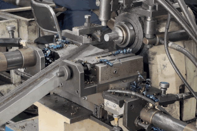 緊接著,在壓力機(jī)精準(zhǔn)作用下,我被鍛造出標(biāo)準(zhǔn)的六角頭部,并通過精密的縮桿工藝,達(dá)到設(shè)計(jì)要求的桿部尺寸。此刻,我已初具螺栓雛形。