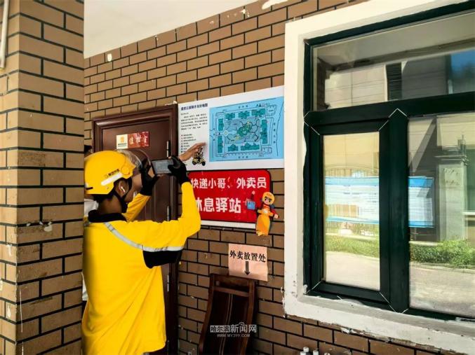在道里區(qū)盛世江南小區(qū)1號(hào)門(mén)門(mén)前“騎手友好地圖”下方,“休息驛站”牌匾醒目掛著。菱建物業(yè)盛世江南服務(wù)中心葛經(jīng)理介紹,服務(wù)中心設(shè)立“暖心”驛站,免費(fèi)提供飲用水、充電器、應(yīng)急藥箱、休息座椅等設(shè)施,還有納涼取暖服務(wù)。