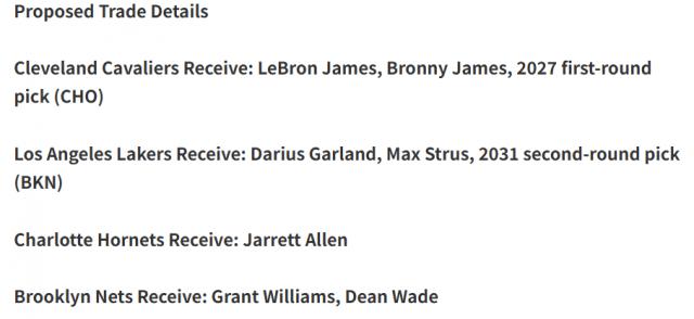 具體交易方案為:騎士得到詹姆斯、布朗尼和27年來自黃蜂的首輪簽;湖人得到加蘭、斯特魯斯和31年籃網(wǎng)次輪簽;黃蜂得到阿倫;籃網(wǎng)得到格威和迪恩韋德。由于騎士下賽季薪資遠(yuǎn)超第二土豪線,交易不能送出現(xiàn)金,也不能用兩個或以上球員打包換更高工資的單個球員。但布朗尼會跟著詹姆斯,且若騎士保留現(xiàn)有陣容,明年夏天他們33年的首輪簽將被凍結(jié),交易得到詹姆斯并送出四人可釋放薪資空間。有詹姆斯在,米切爾的單打?qū)傩钥傻玫结尫?,加上莫布里的攻防統(tǒng)治力,騎士新三巨頭值得期待。