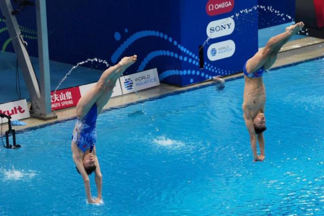 在混雙三米板決賽中,中國隊的程子龍 / 李亞杰出戰(zhàn)。前三跳他們發(fā)揮出色排名第一,然而第4跳失誤,被意大利隊反超,沖擊金牌形勢急轉(zhuǎn)直下。