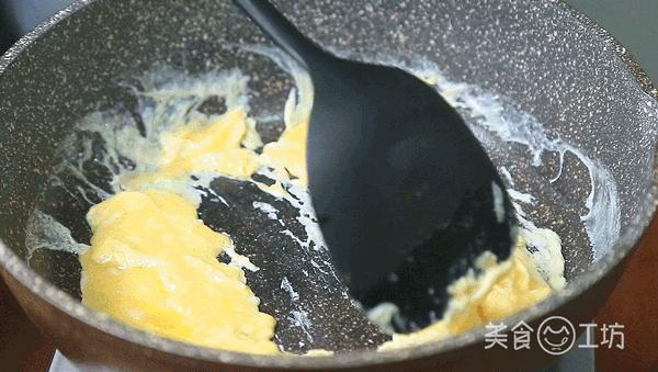 4. 把雞蛋打散,加入適量涼白開(這樣炒出的雞蛋口感更蓬松),然后入鍋炒成碎塊。