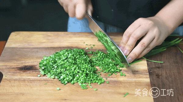 3. 把韭菜洗凈后控干水分,散開晾干,等葉上基本沒水了,再切碎備用。