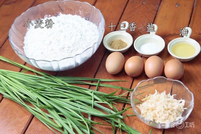 食材準(zhǔn)備:小麥粉 500g、韭菜、蝦皮、雞蛋、80 - 90℃熱水 300g、十三香、鹽、油。