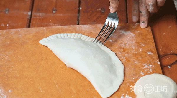 10. 將面皮兩邊合上對齊,用手指捏實,可以手捏出花邊,也可以用叉子按出花紋。