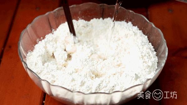 1. 把熱水緩緩加入面粉中,邊加邊攪拌,讓面粉成絮狀。