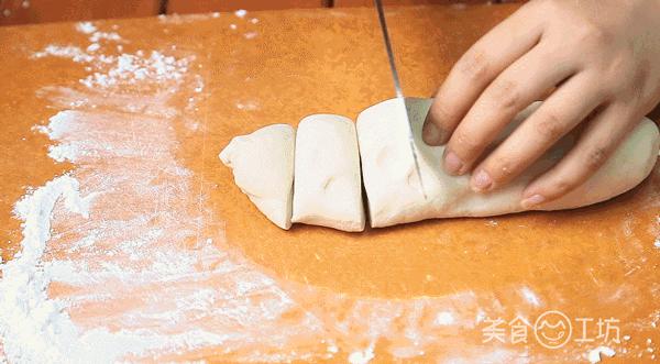 7. 取出靜置好的面團(tuán),再次揉至光滑,然后搓成長條,切成大小均勻的面劑子。