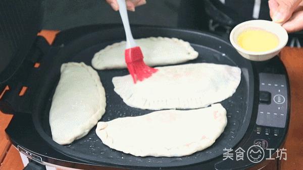 11. 把電餅鐺預(yù)熱,刷上油,放入韭菜盒子,煎至底面焦黃后,再在表面刷一層油,翻面煎至兩面都焦黃就大功告成啦。