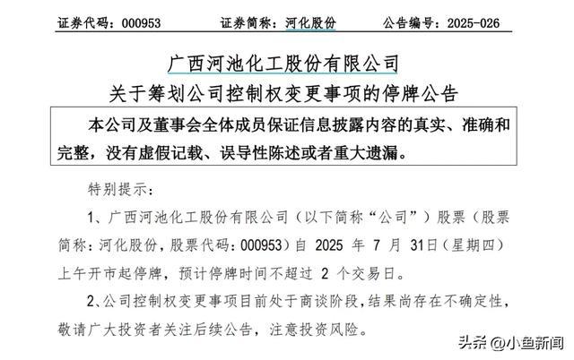 河化股份表示,鑒于該事項(xiàng)正在籌劃中,具有較大不確定性。為保證公平信息披露,維護(hù)投資者利益,避免造成公司股價(jià)異常波動(dòng),公司股票自7月31日上午開市起停牌,預(yù)計(jì)停牌時(shí)間不超過(guò)2個(gè)交易日。