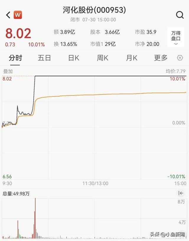 值得注意的是,7月30日,河化股份股價(jià)盤中異動(dòng)拉升,快速漲停。截至收盤,河化股份股價(jià)報(bào)8.02元/股,總市值為29億元。