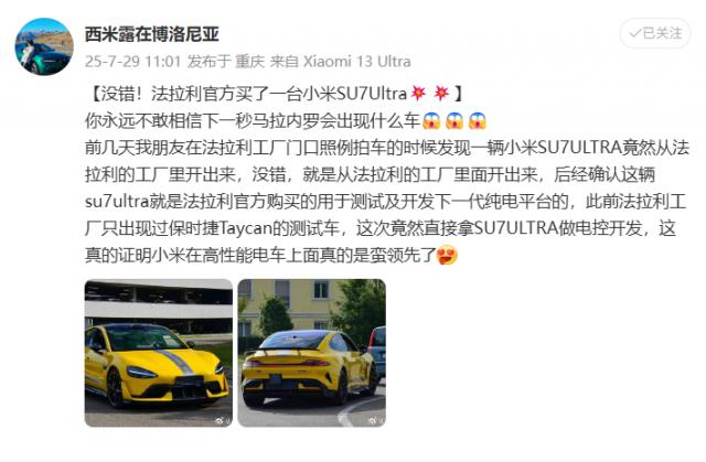 法拉利購買 SU7 Ultra 的消息,在超跑界引起了巨大轟動。2025 年 7 月 29 日,一輛掛著臨時牌照的小米 SU7 Ultra 從法拉利工廠駛出,被路人拍下后引發(fā)全球關(guān)注。經(jīng)博主“西米露在博洛尼亞”證實,這輛車是法拉利官方購買的,用于下一代純電平臺的逆向研發(fā)。