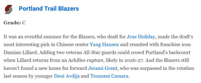 Kevin Pelton評價道:“ESPN對開拓者今年休賽期操作評級為C級別!