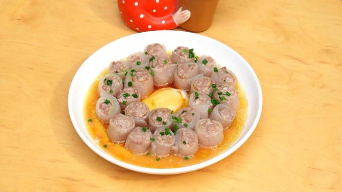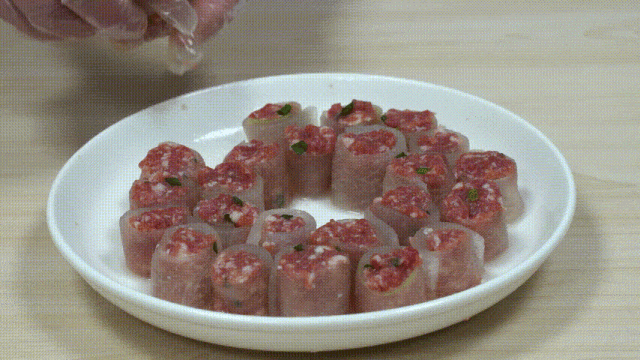 4. 將腌制好的冬瓜卷成圓柱狀,再用肉末填充在內(nèi)部,最后擺放成花朵的形狀。