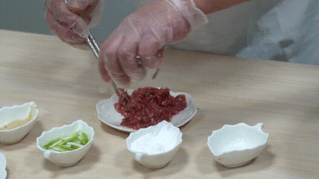 3. 把肉末里加入蔥花、蔥姜水和淀粉進(jìn)行上漿。