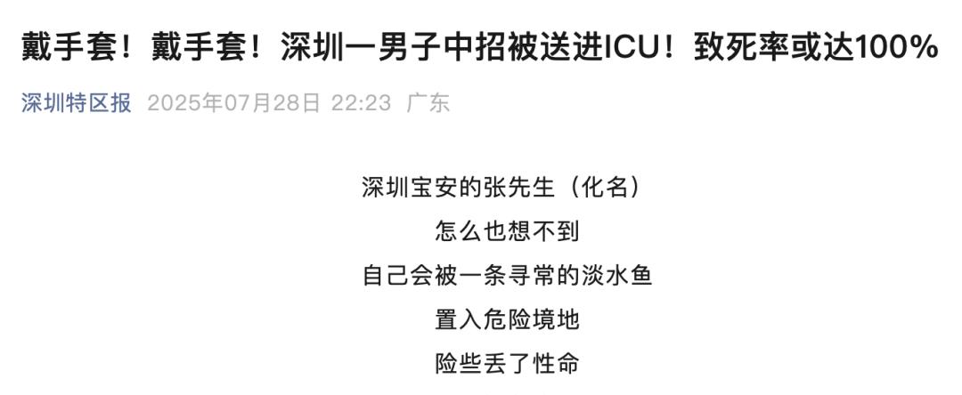 ①2025 - 07 - 28深圳特區(qū)報《戴手套!戴手套!深圳一男子中招被送進ICU!致死率或達100%》