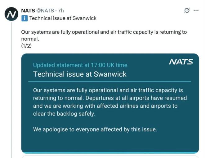 英國航空管制服務(wù)商NATS在社交媒體X上發(fā)布聲明稱:“我們的系統(tǒng)已全面恢復運行,空管能力正恢復正常。所有機場離港航班均已恢復,我們正與受影響的航空公司及機場合作安全處理積壓航班。我們向受此問題影響的所有人表示歉意?!?/p>