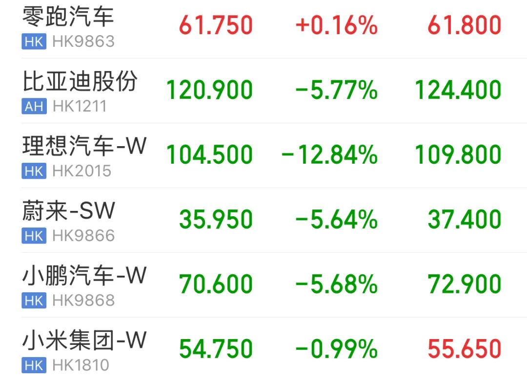 不過,同在港股上市的新能源標的中,零跑汽車微漲0.16%、小米跌幅為 -0.99%。