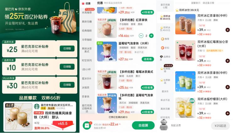 身處這場熱潮中,星巴克自然也積極參與。早在4月,星巴克中國便宣布入駐京東外賣,成為與該平臺全面打通會員體系的首個餐飲品牌。同時,星巴克也積極參與平臺的補貼活動,不少飲品跌破20元的價格區(qū)間,進一步刺激了消費需求。