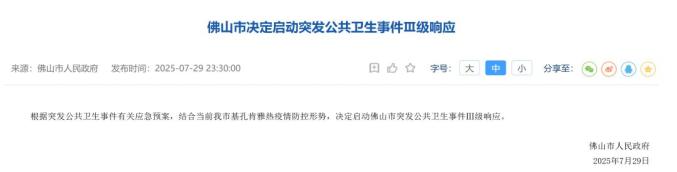 佛山市政府網(wǎng)7月29日晚發(fā)布消息,根據(jù)突發(fā)公共衛(wèi)生事件有關(guān)應(yīng)急預(yù)案,結(jié)合當(dāng)前該市基孔肯雅熱疫情防控形勢,決定啟動佛山市突發(fā)公共衛(wèi)生事件Ⅲ級響應(yīng)。