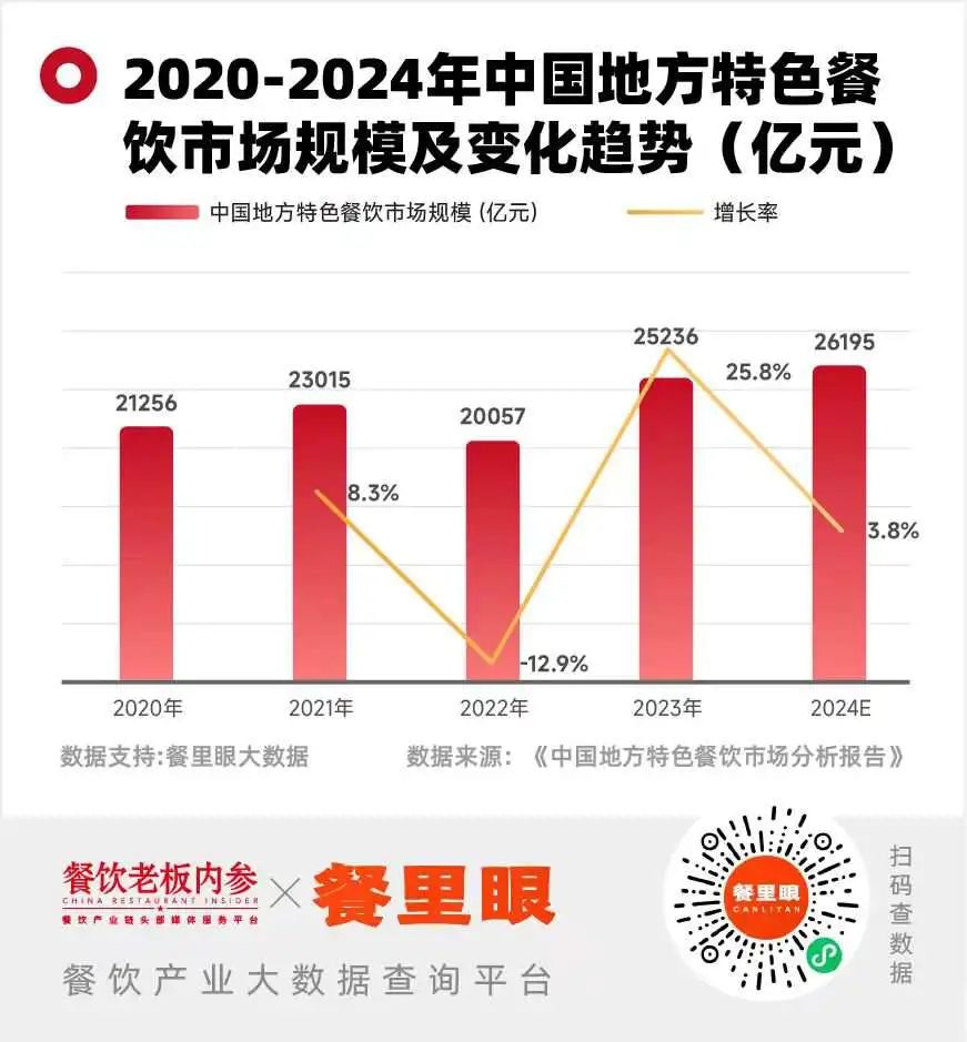 《中國(guó)地方特色餐飲市場(chǎng)分析報(bào)告》顯示,2023年中國(guó)地方特色餐飲總市場(chǎng)規(guī)模為25236億元,預(yù)計(jì)2024年將增長(zhǎng)至26195億元,年增長(zhǎng)率約為3.8%。