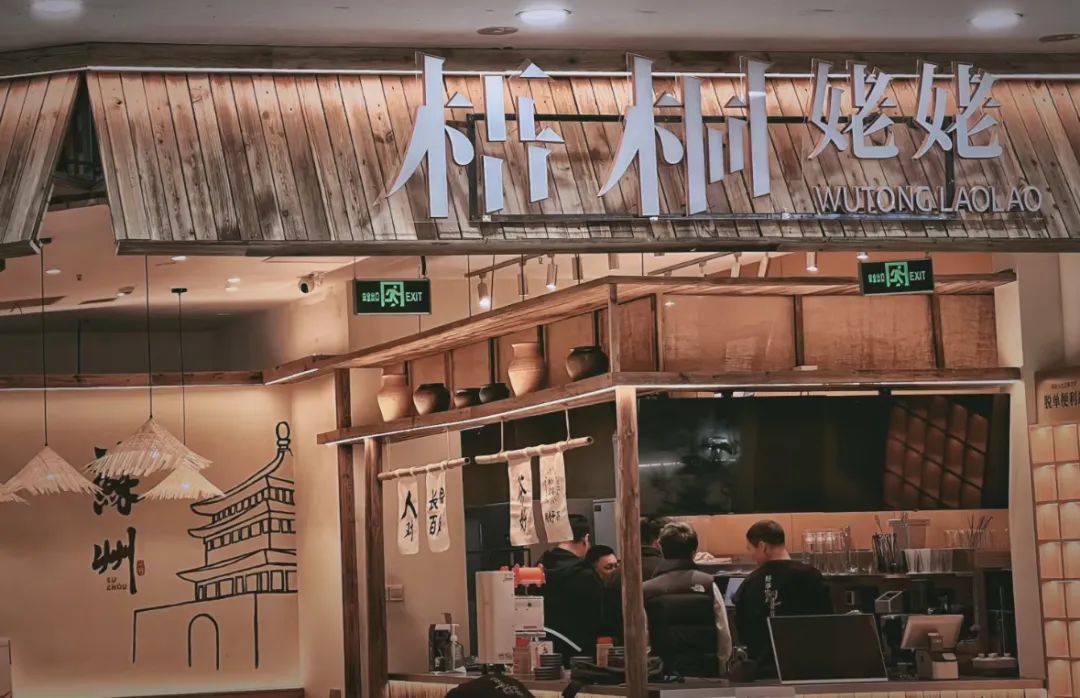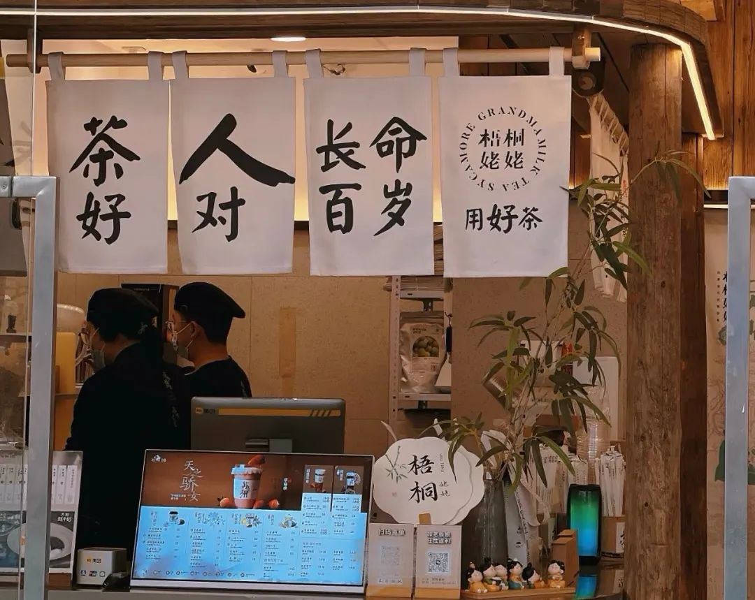 梧桐姥姥以“蘇州制茶”為特色標(biāo)簽,品牌名參考了“鳳棲梧”的典故,門(mén)店設(shè)計(jì)融入了鄉(xiāng)土情懷。