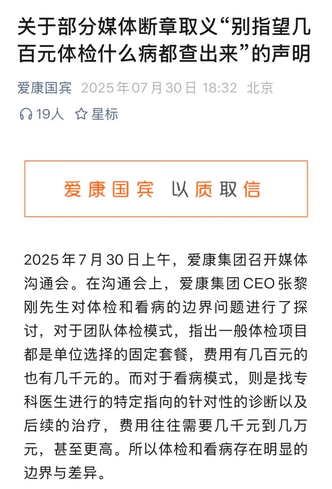 對(duì)此,愛康國(guó)賓在7月30日晚回應(yīng)稱,張黎剛在媒體說明會(huì)上的相關(guān)發(fā)言是在說明體檢和看病二者之間的重點(diǎn)存在不同,體檢在于疾病預(yù)防,發(fā)現(xiàn)疾病風(fēng)險(xiǎn),看病在于希望能夠徹底的對(duì)疾病進(jìn)行確鑿判斷以及后續(xù)的治療。此外,公司還表示,涉案話題斷章取義,侵害了愛康集團(tuán)的合法權(quán)益,愛康集團(tuán)保留對(duì)相關(guān)媒體斷章取義行為進(jìn)行追訴的權(quán)利。