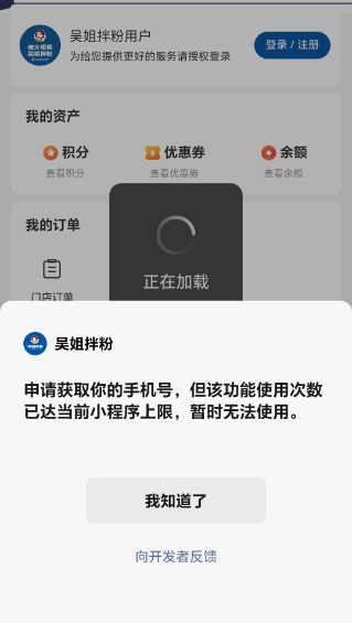 記者嘗試通過(guò)吳姐拌粉品牌官方小程序查詢退款通道時(shí),卻發(fā)現(xiàn)該小程序無(wú)法登錄,新客也無(wú)法注冊(cè),屬于異常狀態(tài)。