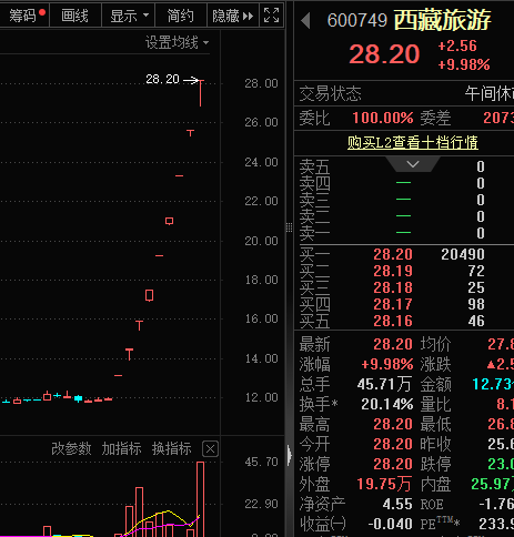 近期表現(xiàn)強勢的西藏旅游,在連續(xù)8個漲停板后,今日早盤仍以漲停開盤,隨后巨量資金涌出,打開漲停。截至午間收盤,西藏旅游再度封死漲停,走出9連板行情,近9個交易日累計漲幅超135%。今日早盤該股成交近13億元,換手率超20%,創(chuàng)歷史天量。