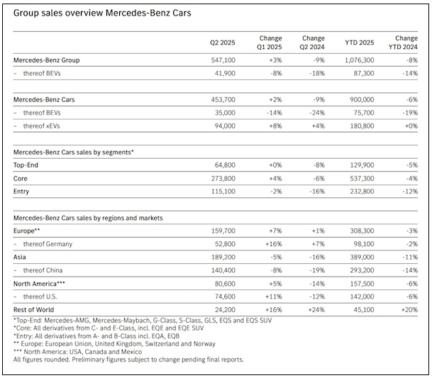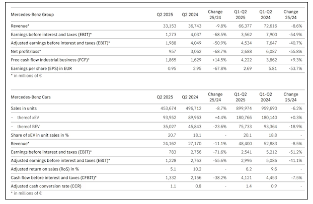 財(cái)報(bào)表明,2025年上半年奔馳集團(tuán)營(yíng)收663.77億歐元,同比下降8.6%,其中第二季度營(yíng)業(yè)收入為331.53億歐元,同比下滑9.8%;稅前凈利潤(rùn)為45.34億歐元,同比下滑40.7%,其中第二季度為19.88億歐元,同比下滑50.9%;稅后凈利潤(rùn)僅26.88億歐元,同比下滑55.8%,二季度為9.57億歐元,同比下滑68.7%。