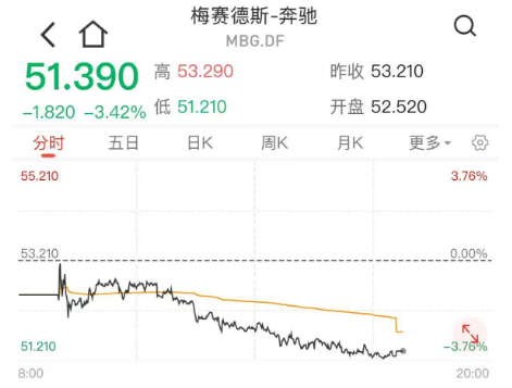 7月30日晚間歐洲交易時(shí)間,業(yè)績(jī)發(fā)布后,梅賽德斯 - 奔馳股價(jià)震蕩下跌,截至收盤,股價(jià)跌3.42%,總市值跌破500億歐元。