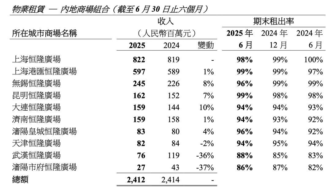 2025年上半年,恒隆在上海的兩個(gè)商場——上海恒隆廣場和港匯恒隆廣場分別實(shí)現(xiàn)租賃收入8.22億港元和5.97億港元,占內(nèi)地所有商場租賃收入近6成。由于客戶對高端消費(fèi)變得謹(jǐn)慎,上半年上海恒隆廣場租戶銷售額下降8%,港匯恒隆廣場則同比增長10%。
