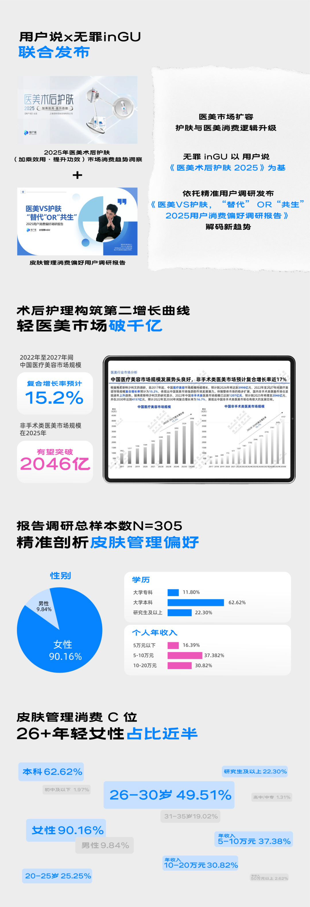 答案并非簡單的是或否。知名成分黨護膚專家@無罪inGu聯(lián)合用戶說發(fā)布的《醫(yī)美VS護膚,“替代”O(jiān)R“共生”——2025年用戶消費偏好調(diào)研報告》,基于用戶說數(shù)據(jù)庫以及對@無罪inGu粉絲群體的深入調(diào)研,將為我們分析二者之間復(fù)雜而微妙的關(guān)系。