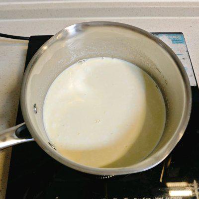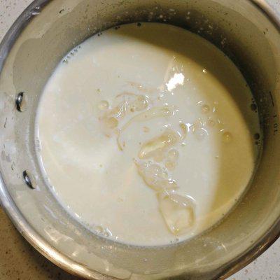 4、牛奶冷卻到 50~60 度時(shí),加入擠干水分的吉利丁片,攪拌至融化。沒溫度計(jì)可用手摸奶鍋外面,覺得燙手但還能忍受就行。溫度太高會(huì)使吉利丁失效,影響奶凍凝固。